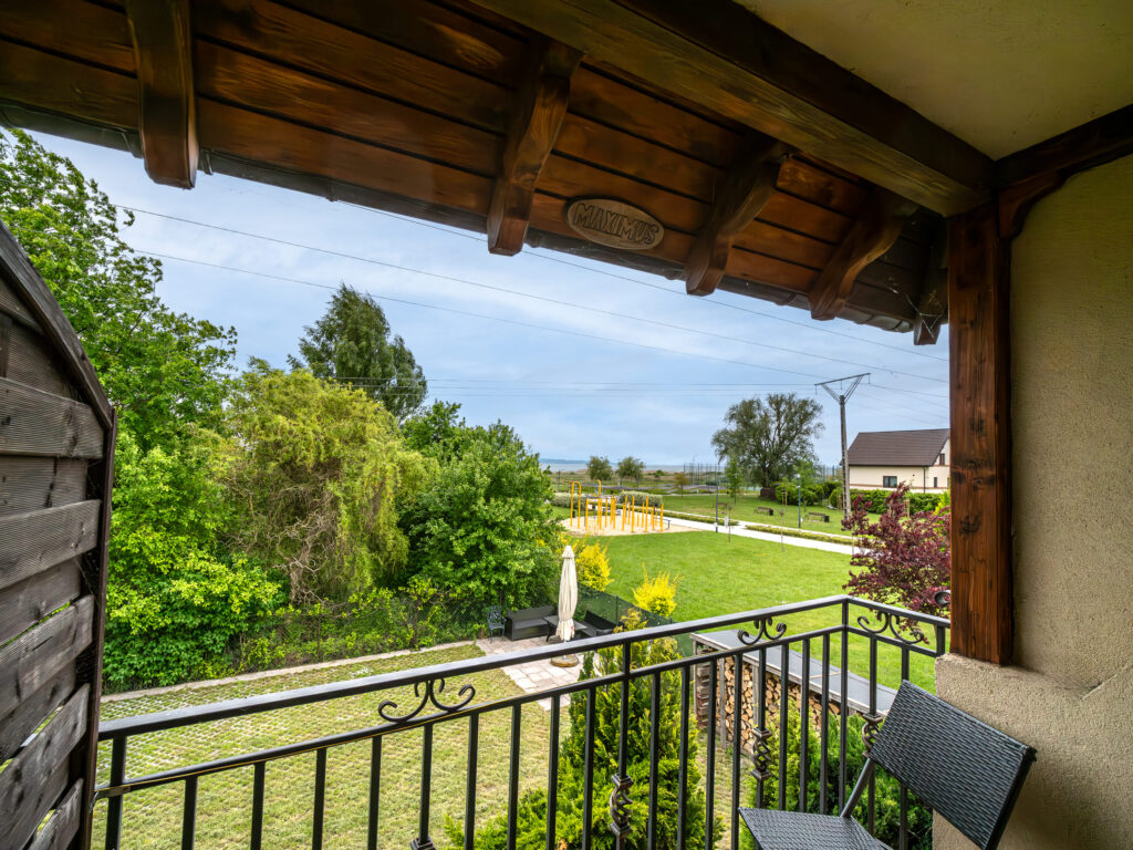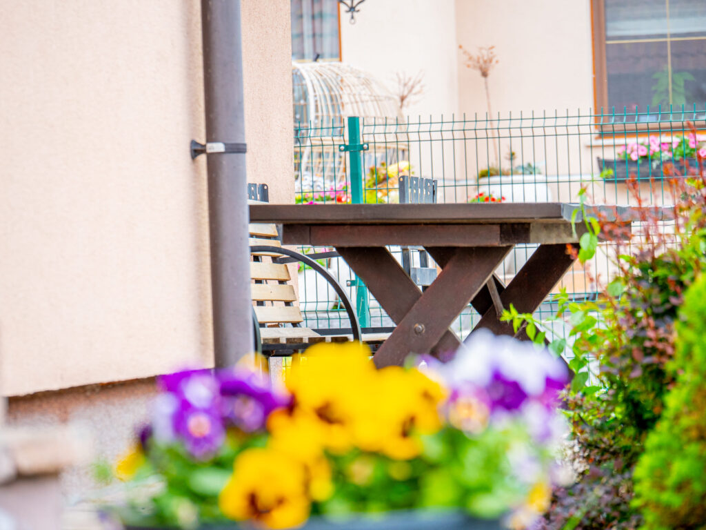 Dom i ogród są ogrodzone, co zapewnia bezpieczeństwo i prywatność. Przed budynkiem znajduje się duży taras ze stołami i ławkami — idealny na poranną kawę lub wieczorny relaks.