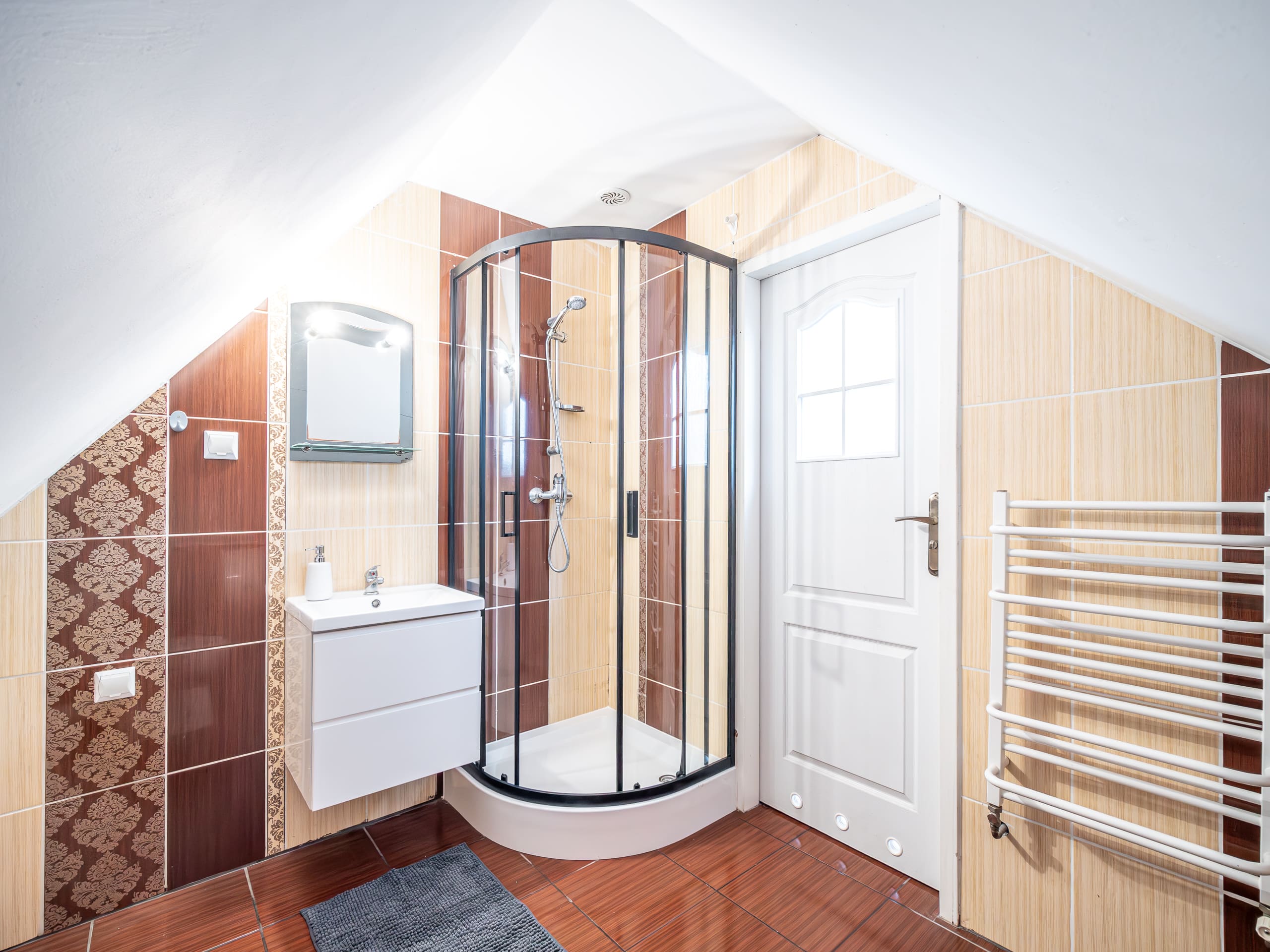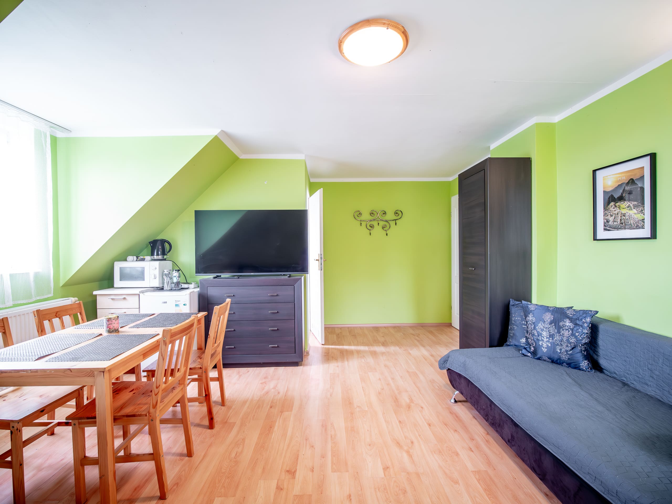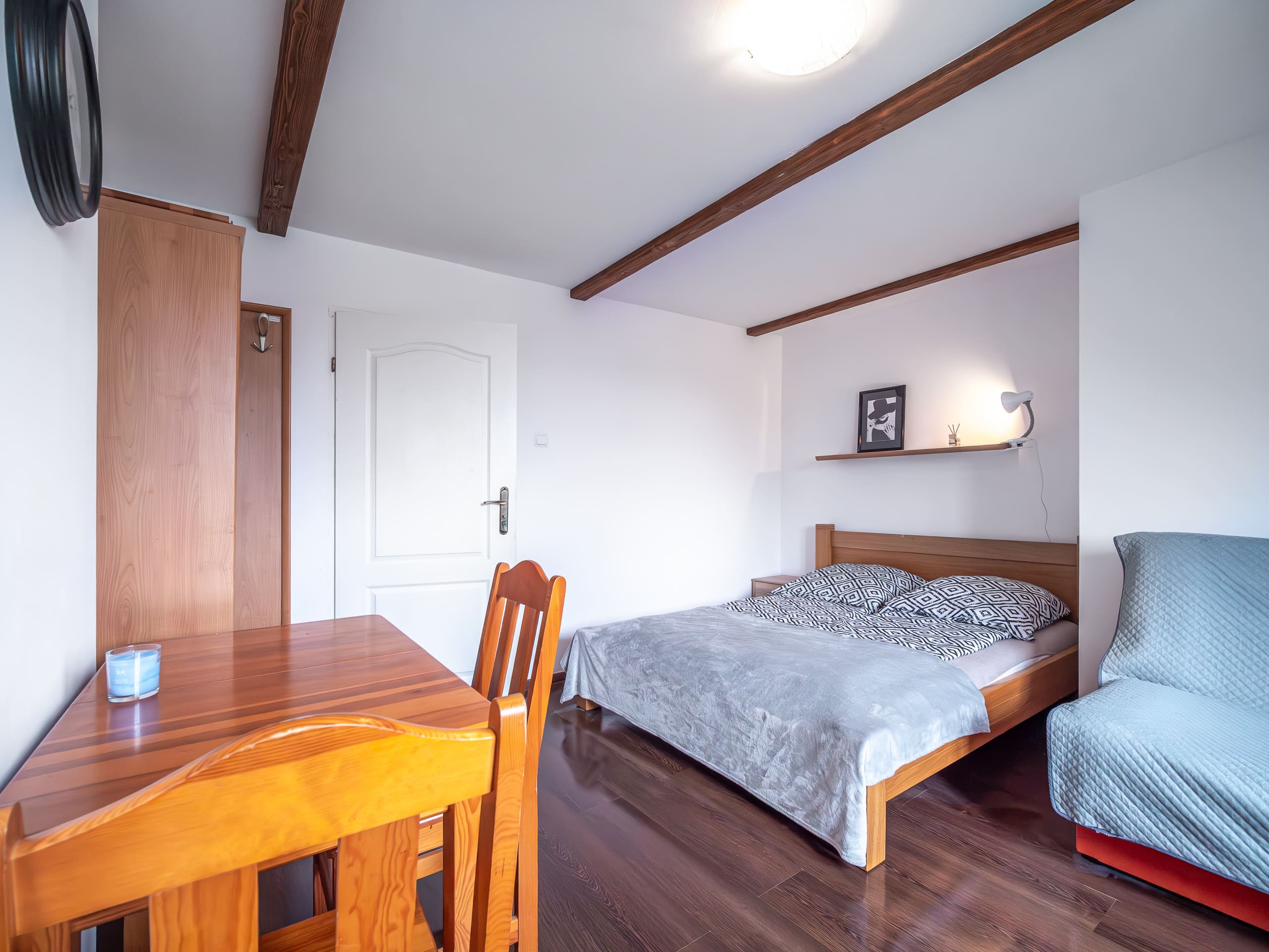 Dla większych rodzin lub osób ceniących przestrzeń przygotowaliśmy dwupoziomowy apartament. Na parterze znajduje się przestronny salon z aneksem kuchennym, jadalnią oraz łazienką. Na piętrze – oddzielna sypialnia. Apartament wyposażony jest m.in. w dużą lodówkę, zlewozmywak, czajnik i komplet naczyń. W części wypoczynkowej znajdują się wygodne kanapy, stolik kawowy, stół z krzesłami oraz telewizor z kanałami satelitarnymi.